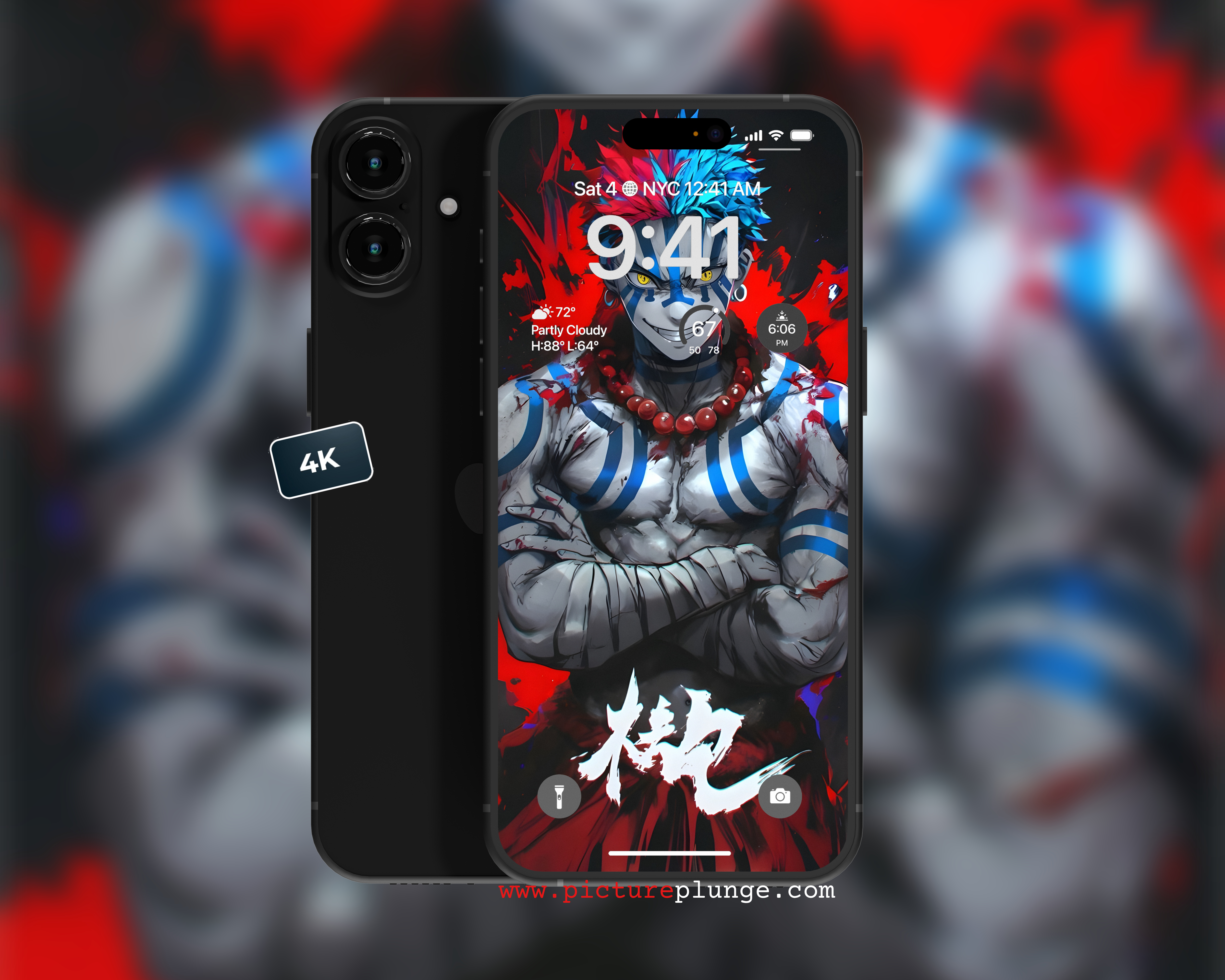 Download a powerful 4K wallpaper of Akaza, the Upper Rank Three demon from Kimetsu no Yaiba (Demon Slayer). With his iconic blue markings, intense yellow eyes, and fierce energy, this high-resolution anime artwork is a must-have for fans of the series and anime villains.